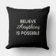 This design features a black velvet textured background along with the text "Believe Anything Is Possible". This custom throw pillow makes a great inspirational gift. Available in three sizes.