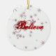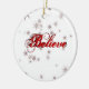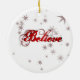 The word "believe" in red with slight black outline against a background of silver seven pointed stars.