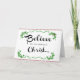 Believe the true meaning of Christmas religious card with white background, green floral swirl frame and red and white stripe border.