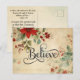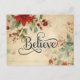 Christmas postcard depicts a beautiful vintage floral with a red poinsettia and greenery on a beige background. It features a simple but powerful inspirational Christian quote to "Believe". The inside Bible Verse John 1:12, "to those who believed in his name, he gave the right to become children of God—" The greeting, prayer can be customised or deleted for a hand written message.