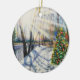 A beautifully trimmed Christmas tree stands in the middle of the forest, shining in a sunburst day of winter. Deep snows catch the light and hint at the footprints of the kind soul who came into the woods to hang lights and ornaments upon the branches to make a little Christmas magic. Holiday ornament.