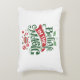 A pillow with a cute illustration. Text says Believe in the Magic in fancy lettering. Decorated with christmas balls.