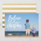 A perfect choice for your Christmas holiday greetings to your friends and family, a beautifully, simple holiday photo card design with the words "Believe in the Magic of Christmas" written in a trendy white script hand lettered font overlay. Design by ELKE CLARKE© Available exclusively at www.zazzle.com/monogramgallery*. Replace sample photo with your own. Gold and white striped background on back of card. Other colours available in store