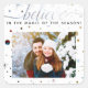 This BELIEVE holiday design combines a traditional theme with a modern text effect -- change the picture, change the colour scheme! That's fun, right? Your photo determines the colour of the script typography "Believe," as well as the sparkles and snowflakes! This styling ensures that the typography and printed accents will match your photo. The line of text beneath "Believe" -- "in the Magic of the Season" -- may be customised, as well.