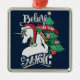 "Believe in the Magic" declares the white unicorn in this elegant Holiday ornament. The unicorn wears a red Santa hat, and has a red and white striped horn. He stands in front of a decorated Christmas tree. Everything is placed on a navy blue background.