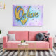 Inspirational word "Believe" is a golden yellow with matching yellow and orange hearts below the word. A pale blue background outlines the letters. The edges of the painting are in lavender and magenta colour washes. A light layer of glitter adds contrast and character to the painting. The "Believe" artwork was rendered in watercolor on paper. Personalise this inspirational word art wrapped canvas with your own text or images to make special inspirational art gifts! The inspirational word painting series are taken from the text used in the angel or other art paintings. "In my life I choose to believe in hope " -Feel Beauty These images are designed so as to provide reflection and meditation on a single word. The idea is to think about the painting and it will help you have a positive attitude associated with that word which will be emotionally healing to a person. You can also combine them together to make your own word series for meditation/ contemplation. Profits from this sale support the non-profit 501(c)3 DonnaBellas Angels.