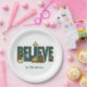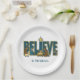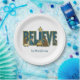 The word "Believe" with a beautiful nativity scene on a holiday plates containing the manger with baby Jesus, Mary, Joseph, a shepherd, sheep and a donkey. You can customize with your own quote. Great for Christmas parties or for Christian family and friend get-togethers over the holidays.