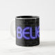 Illuminated urban brick wall with believe text in glowing purple neon lights.