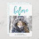 Send your loved ones a stylish, modern holiday photo card this holiday season. The chic Christmas photo card features the word "Believe" in a blue watercolor script font, photo and text placeholder, and watercolor dot pattern on back.