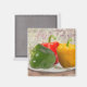 Bell peppers in green, yellow and red sit on a white plate ready to be cooked. The original is a miniature oil painting by Kathie Miller