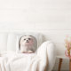 Darling white Maltese puppy dog sitting and posing very nicely on a pretty pink blanket colour photograph.