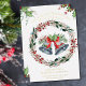 Holiday Greeting Card with luxury gold foil typography framing a rustic twig wreath with silver bells scattered with snow and accents of holly. The wording reads "the bells are ringing out with love and joy" in elegant typography. Traditional festive design and the template is ready for you to add your greeting and personalised text.
