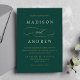 Simple, classic wedding invitation featuring your names and wedding details displayed in gold foil lettering with calligraphy script accents on a dark emerald green background. The back of the gold foil wedding invitation features an emerald green and white trellis design. The design coordinates with our Beloved wedding collection.