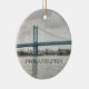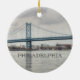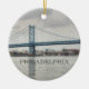This is the Ben Franklin Bridge, which joins the cities of Philadelphia, Pennsylvania, and Camden, New Jersey. Its reflection can be seen in the Delaware River. This photo was taken from the Camden waterfront, looking towards Philly.