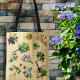 Herbs and flowers tote bag with all over garden design. Beneficial bumblebees and dragonflies visit greenery of basil, oregano, and ginseng. Also included in the design is lavender, elderberries, and feverfew's white flowers. The herbs and insects design is printed over a background of thin, gold stripes. Makes a great gift for the herbalist, gardener, and nature lover.