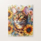 This jigsaw puzzle features a Bengal cat surrounded by vibrant sunflowers and light pink roses.