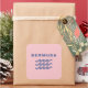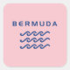 Stylised design shows three ocean or water waves and the word "Bermuda" above in a cool modern text. Design is all-blue. Bermuda pink background colour.