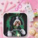 A furry friend behind the handlebars of a shiny green bike, wearing a green Saint Patrick's Day outfit that makes heads turn. The dog is dressed in a festive ensemble, complete with a green bow tie and a matching top hat that sits snugly atop their head. The outfit features intricate designs of shamrocks and leprechauns, making it clear that this dog is ready to celebrate Saint Patrick's Day in style.