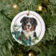 On the front of this Holiday ornament is a beautiful portrait of a majestic Bernese Mountain Dog peeking out of a holly and evergreen bough. Red berries and pine cones decorate the holly and pine sprigs. The image is placed on a white circle within a thin red line circle. The back of the ornament has the same evergreen bough wreath and circle with your custom text in red.