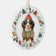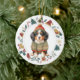 This cute Holiday ornament features a watercolor image of an adorable Bernese Mountain Dog dressed in his winter sweater and hat. The image is framed within a colourful circle wreath made up of various Holiday images, including a snowman, bells, candy cane, stocking, holly, and more! The back of the ornament has the same wreath image with your custom text in green, gold, and red.