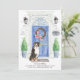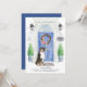 Announce your new address with our stylish announcement featuring a Bernese Mountain Dog, blue front door, welcome mat, slate sign, topiaries and a floral wreath set on a grey brick background.
