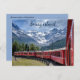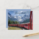 This postcard features the Bernina Express in Switzerland. According to the photographer, " The Bernina Express of the Rhaetian Railway in the Montebello Curve on the way to Pontresina. In the background you can see the Morteratsch Glacier". Photo credit: Andreas Stutz, 2019.