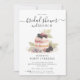 This invitation is a combination bridal shower and brunch featuring a scrumptious looking watercolor pink and white layered dessert with berries. Indulge in a spread of sweet and savory delights as we toast to the bride-to-be, amidst charming décor and cherished company. The type is a mix of modern trendy script and a classic vintage serif font.