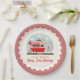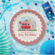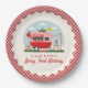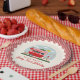 "Berry First Birthday" strawberry themed first birthday party theme featuring illustration of strawberry farmer's market trailer decorated with balloons, bunting, and a birthday cake on picnic table. Border is red gingham.