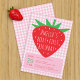 The background is pink and white gingham chequered plaid pattern. The title "[Name]'s Berry First Birthday" is written in white caps in a big red strawberry with the green leaves upside in the upper part. In the lower part, in a pink rectangle with round corners, there is the info, in red text, with the date / time as a the left column, with the day big and green.