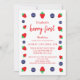 Berry sweet 1st birthday invitation with strawberries and blueberries with a chequerboard picnic style background.
