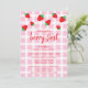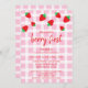 Berry sweet strawberry 1st birthday invitation with red fruit and chequerboard style background.