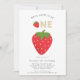 Simple minimalistic berry sweet to be one themed 1st birthday invitation freaturing a large strawberry in the centre on a crisp white background with the text saying berry sweet to be one ,