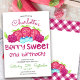 Berry Sweet 2nd Birthday Invitation - editable template is easy to personalise for a little girl turning 2. The design features cute and colourful berries - strawberry, raspberry and blueberry - with hand lettered, whimsical typography. The back of the invite has pink gingham borders with more yummy berries.