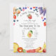 Fruit themed baby shower featuring illustrations of blueberry, pear, strawberry, peach, pineapple, grape, watermelon, banana, orange, apple, and raspberry.