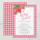 This cute baby shower invitation features watercolor strawberries and leaves on a plaid gingham background.