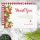 Cute and summery strawberry theme baby shower thank you cards, with a classic picnic table cloth buffalo check pattern in red and white on the reverse.