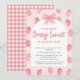 This cute strawberry-themed girl's baby shower invitation features watercolor strawberries and pink script typography on an arch background. The back is decorated with a pink plaid gingham. It reads "Someone Berry Sweet Is On The Way" and is easily customizable. Original Watercolor © Michele Davies