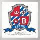 Knights style shield crest monogram letter B art name poster perfect for a boys bedroom or playroom in shades of red, blue white and grey. Personalise with your child's own name and name meaning for a personalised touch to your child's bedroom or nursery, this example is for the name Bertie Bright raven An intelligent, magnificent warrior. Poster print ideal for a gift to a new baby boy, for a christening, baby naming or baby shower gift. Unique shield drawing, graphic art, name research, wording and design by Sarah Trett. www.sarahtrett.com for www.mylittleeden.com