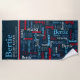 Typographic short name blue, red, white text on a dark blue background custom name meaning beach towel. Background colour can be changed if required. Fun personalised graphic text personalised towel. Personalise with your own short name and name meaning or other words, currently reads Bertie Bright raven. An intelligent, magnificent warrior. © Art and design and name meaning by Sarah Trett for www.mylittleeden.com