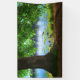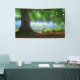 A peaceful summer afternoon beside a still lake, looking out from beneath the shade of a red maple tree with its branches and green leaves overshadowing the water's edge. Water lilies float on the shining surface, and a stork stands motionless in the water, while dragonflies and butterflies dance among the irises and cattails lining the bank. Sunlight glints and sparkles off the little ripples out in the lake.