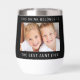 Give the best aunt ever a fun gift with this custom black thermal wine tumbler. Easily add two favourite photos of her nieces and or nephews. Personalise "This Drink Belongs to" to her favourite beverage (e.g., beer, soda, etc.) and "Best Aunt Ever" to something similar in length such as "World's Best Aunt," and whether she is called aunt, auntie, tia, etc., all in modern white typography.