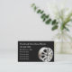 Cool automotive business cards for anyone who sells car tires and wheel rims designed with a carbon fibre style background and image of a car tire wheel and simple layout presented on glossy business card stock. Best business cards for an automotive business.