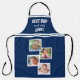 This fun Father's Day apron features four square photos for pictures of children or dad. Bold white text "Best Dad and chef Ever" appears at the top of the apron on a dark blue background. Four square photos appear on the bottom portion of the apron.