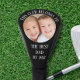 A fun black golf club head cover for a golfer dad featuring "This Club Belongs to the Best Dad By Par" in classic white serif typography and a photo of his children.