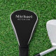 An elegant black golf head cover for a golfer dad featuring his name monogrammed in classic white serif typography and "Best Dad Ever" in simple modern white typography.