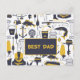 For Father's Day. "Best Dad" in gold on blue rectangle. A pattern of fishing equipment including fish, hook, bucket, net, boat motor, rod and reel and much more. Perfect for the fishing enthusiast