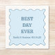 Celebrate your special day in style with these customisable "Best Day Ever" wedding napkins, featuring a calming blue background and bold navy text. The whimsical scalloped edge adds a playful yet elegant touch, perfect for modern weddings, bridal showers, or rehearsal dinners. Easily personalise with your names and date for a personalised accent that guests will love. The contrasting colours and bold font make these napkins an eye-catching detail for your table settings, elevating the aesthetic of your event. Ideal for couples looking to combine classic elegance with a fresh, contemporary twist, these napkins bring a chic charm to any celebration.