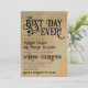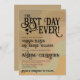 This fun wedding invitation features a retro inspired modern design with a background of curved stripes in neutral earthtone colours including tan, taupe, and sage green. The caption reads: The Best Day Ever! and is written in fancy word art lettering with curls, swirls, swashes, and hearts. Wonderful way to invite your friends and family to share in your joy on your special day!