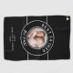 Creating your own personalised golf towel is super easy with our online template. All you need to do is upload your favourite photo and type in a monogram, name, or any text you want. You can also choose the colours of the text and the background to match your dad’s style. The photo and the text are printed in white with two circular white borders, which contrast with the solid black background.