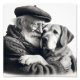 A captivating black and white artistic portrait featuring a distinguished elderly gentleman in a classic beret and glasses, sharing a tender moment with his loyal Golden Retriever companion. This beautifully detailed monochromatic artwork captures the timeless bond between man and his best friend, showcasing exquisite textures from the knitted sweater to the dog's silky coat. The warm, intimate composition evokes feelings of companionship, loyalty, and unconditional love. Perfect for dog lovers, vintage art enthusiasts, or anyone who appreciates the special relationship between humans and their canine companions.